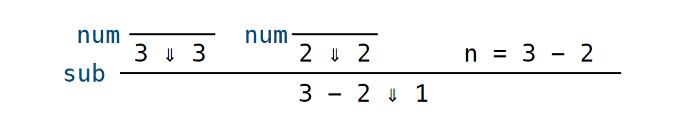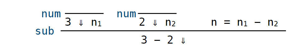 e1과 e2에 각각 3과 2를 대입. 그리고 위에 있는 num rule를 사용해서 n1, n2의 값에 배정.