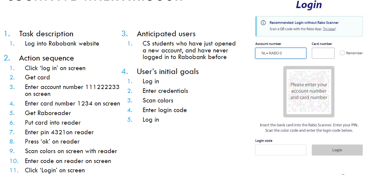 Cognitive walkthrough is an evlauation method for manually simulating user's cognitive processes as the user interacts with an user interface in an effort to accomplish a specific task.