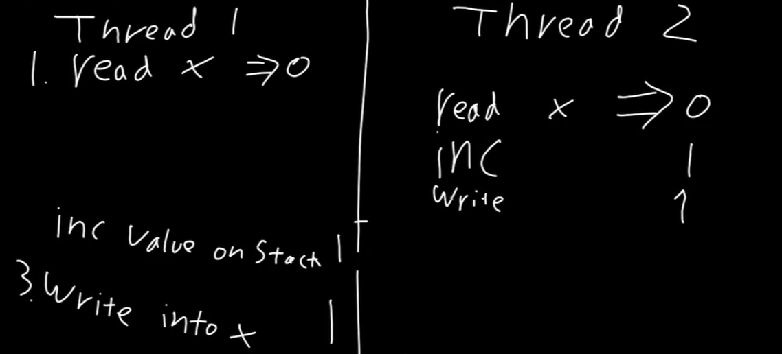 After reading x in step 1, in between step 1 and 2, the other thread can perform the operation (so we skipped one increment count). 그래서 600이나 6000 count 아님.