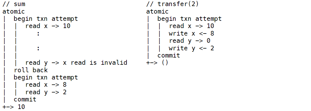 → Transactions must not have side-effects outside of what is retryable (side effect actions such as printing)