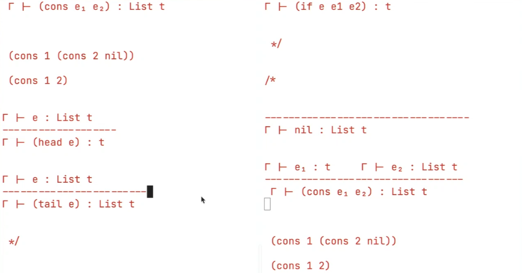 3. (cons e1 e2)에서 e1의 타입은 t여야하고 e2의 타입은 List t이어야 한다 (nil도 가능).