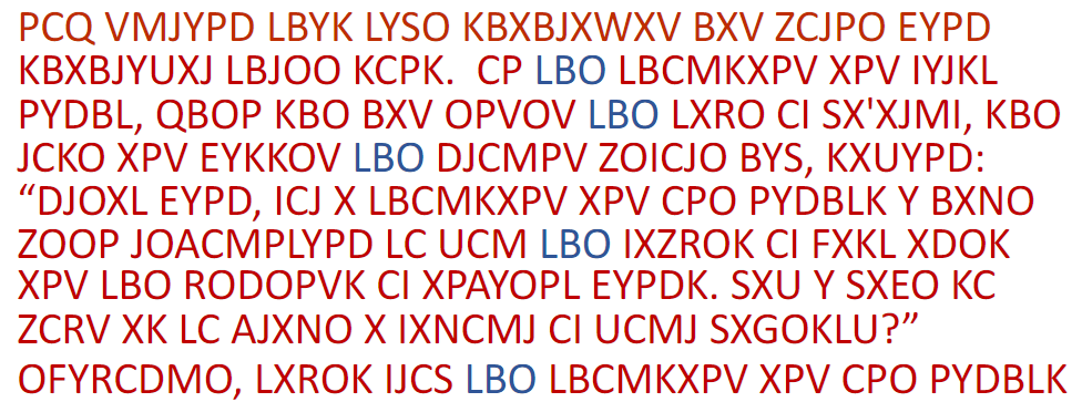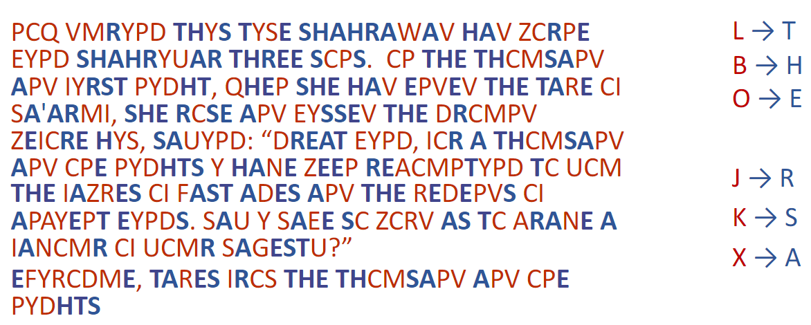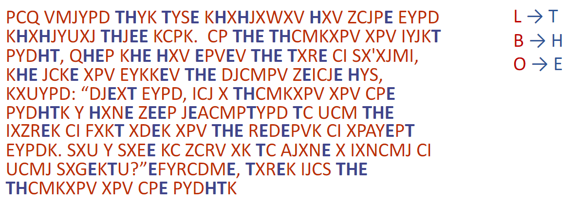 여기서 L = T, B = H, O = E로 유추를 해보겠다. 그리고 Plaintext를 변환하면 다음과 같이 된다.