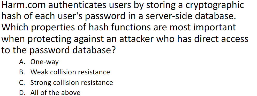 B: Need also weak collision resistance (cannot find another password that has the same hash value, so gets authenticated)