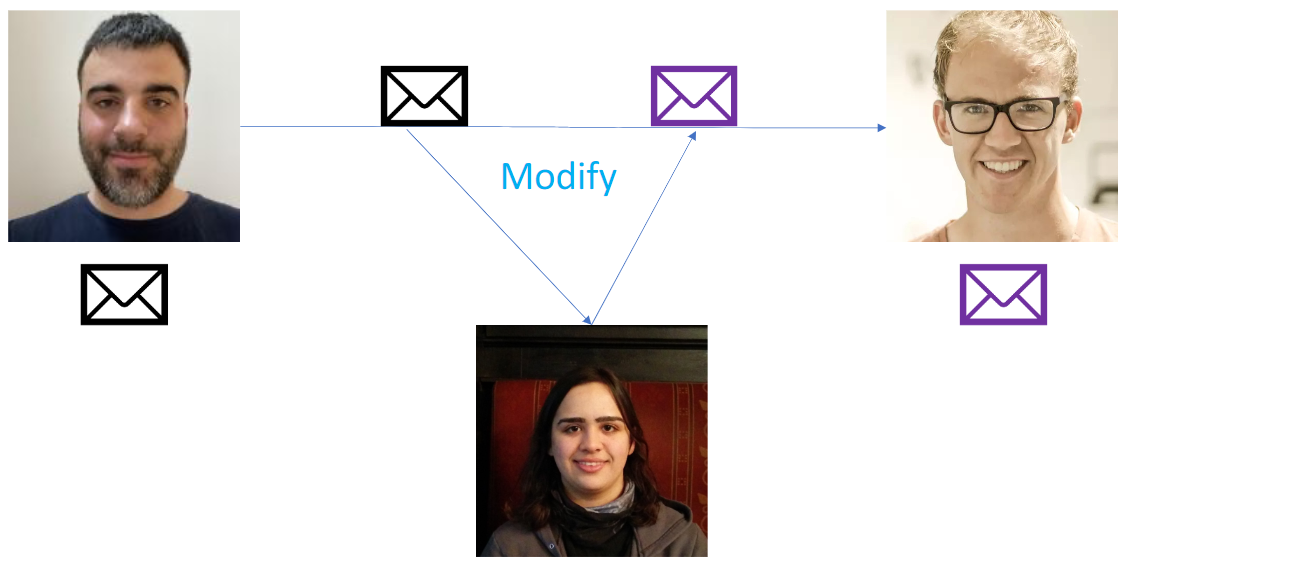 Tampering: 부당 변경 (보내는 메시지 modify 해서 보냄. 수신자는 변경된 메시지 받음)