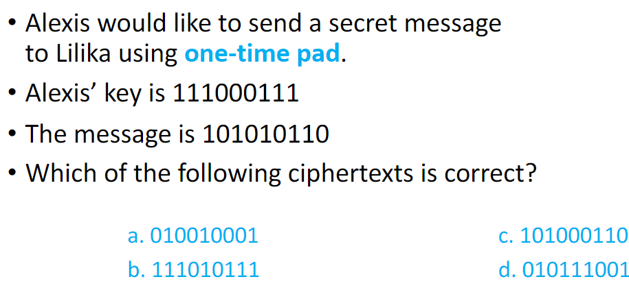 - Fully secure if key used only once (one-time pad has perfect secrecy assuming a truly random and secret key that has not been reused)