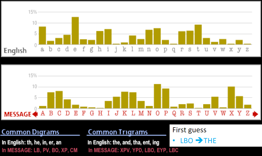 여기서 LBO가 자주 등장하는데 이거를 가장 많이 쓰는 and, the 등으로 가정. 혹은 아래에 있는 사진처럼 Plaintext에 있는 알파벳의 빈도와 평상시에 많이 사용되는 빈도를 비교해서 유추.