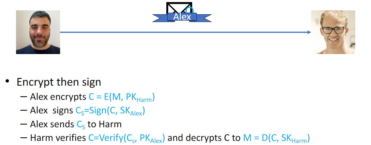Alex wants to send a message that only Harm can read and that only he can have sent.