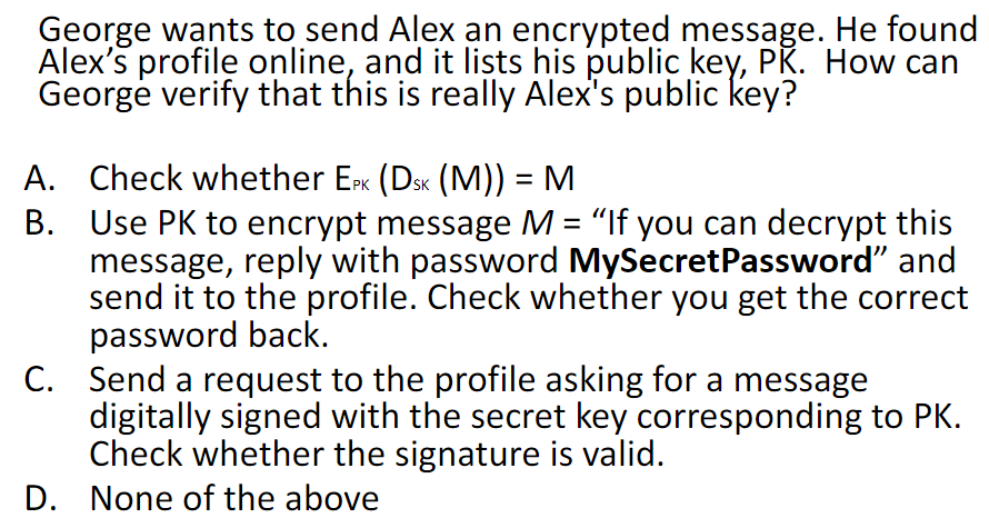 Methods B and C assure George that he is interacting with a party who has possession of the private key corresponding to the posted public key. However, they do not prove this party is Alex.