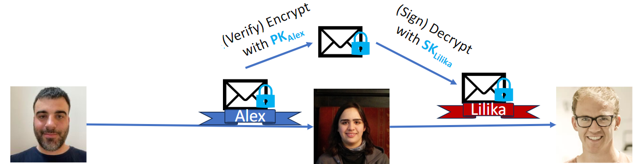 - Lilika replaces S with her signature S' on Cs, and forwards (C, S') to Harm