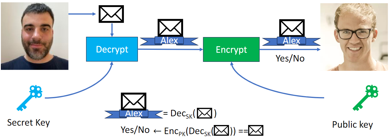 Alex "decrypts" plaintext message M with the secret key and obtains a digital signature on M