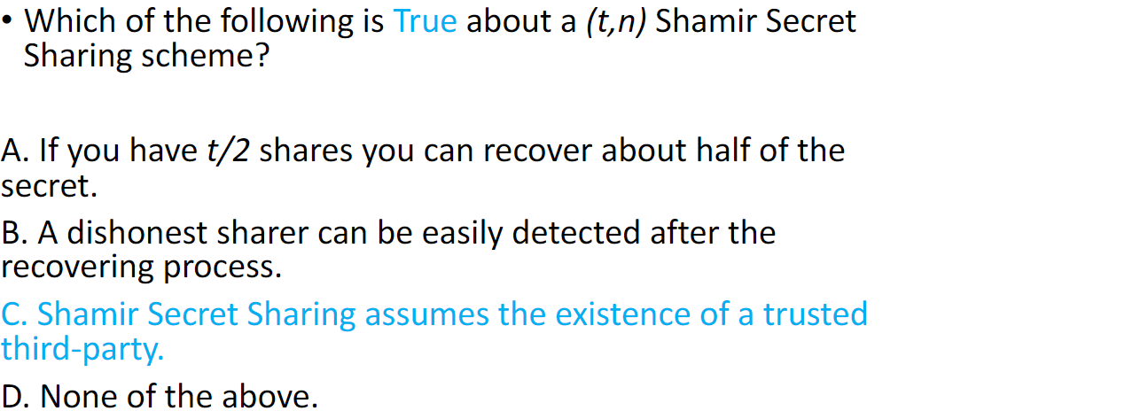 - No information about s can be recovered from fewer than all shares