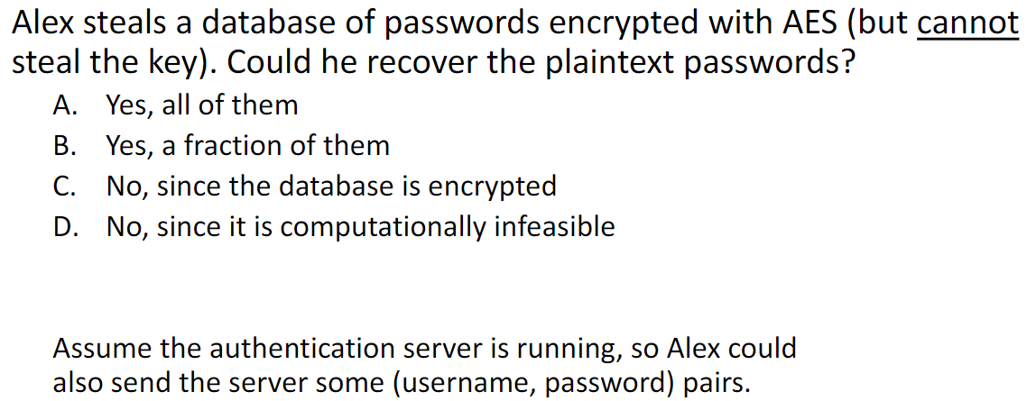 Humans pick bad passwords (common passwords → frequent analysis 통해 비밀번호 알아낼 수도 있음)