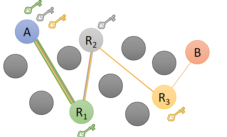 - Decrypt and forward to next node (R1 receives the payload/message and decrypts it and figure out that R2 is the next node...)