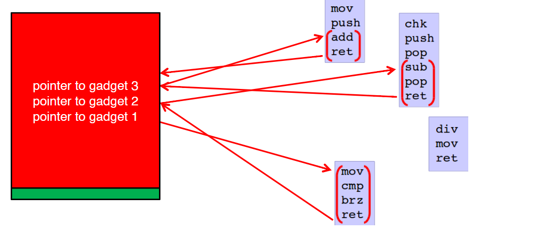 Instead of functions , we can overwrite the stack with return address to the pointer to the gadgets