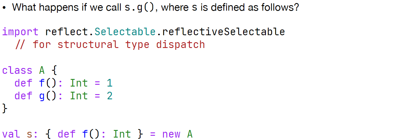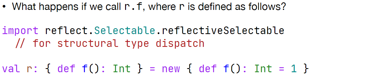 → 1 (r implements a structural type that has a field f. Anonymous class that has a single method that returns 1.