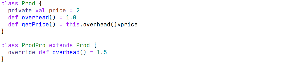 Because I have defined the getPrice method such that it calls the overhead method of this, I can define subclasses/subobjects that override the overhead method but still allow me to call getPrice() to multiply the overhead of the subclass to the price of the superclass
