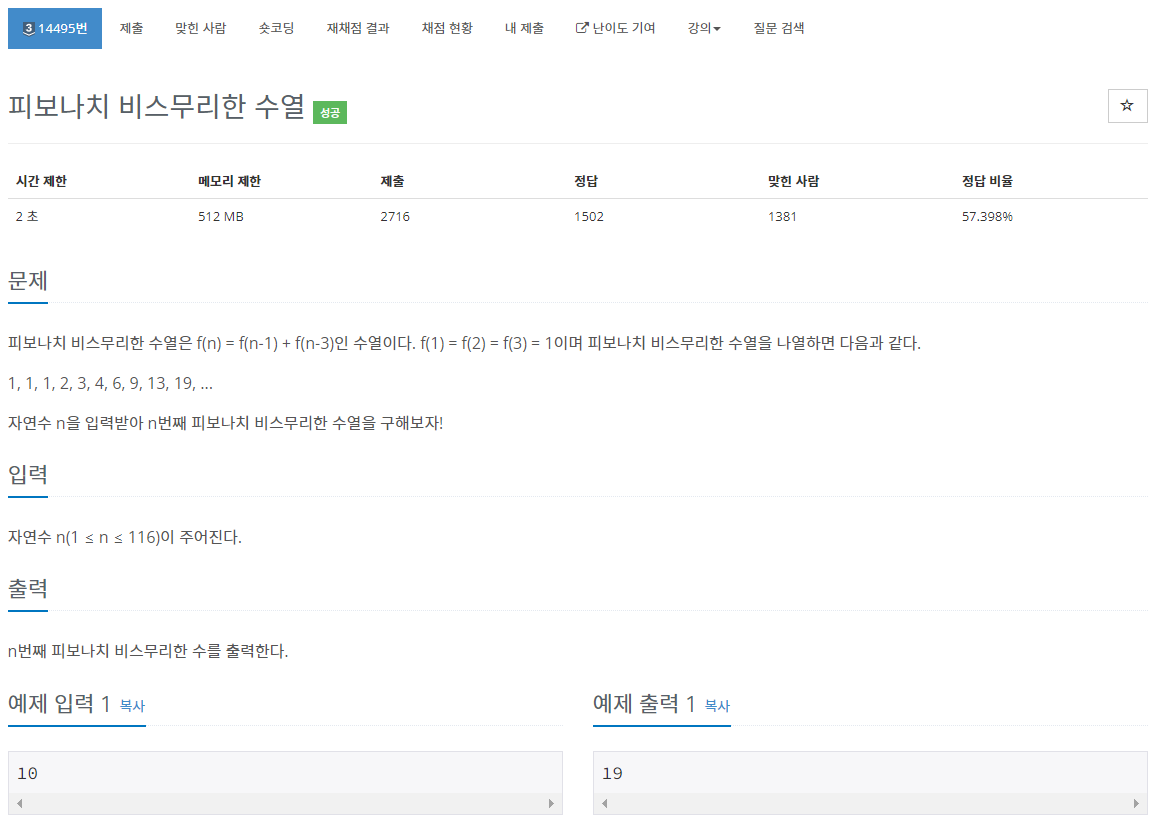 백준 14495번 피보나치 비스무리한 수열은 피보나치 수열과 매우 흡사하다. 피보나치 수열은 f(n) = f(n-1) + f(n-2)인데 이번 문제에서 나온 수열은 f(n) = f(n-1) + f(n-3)이다.