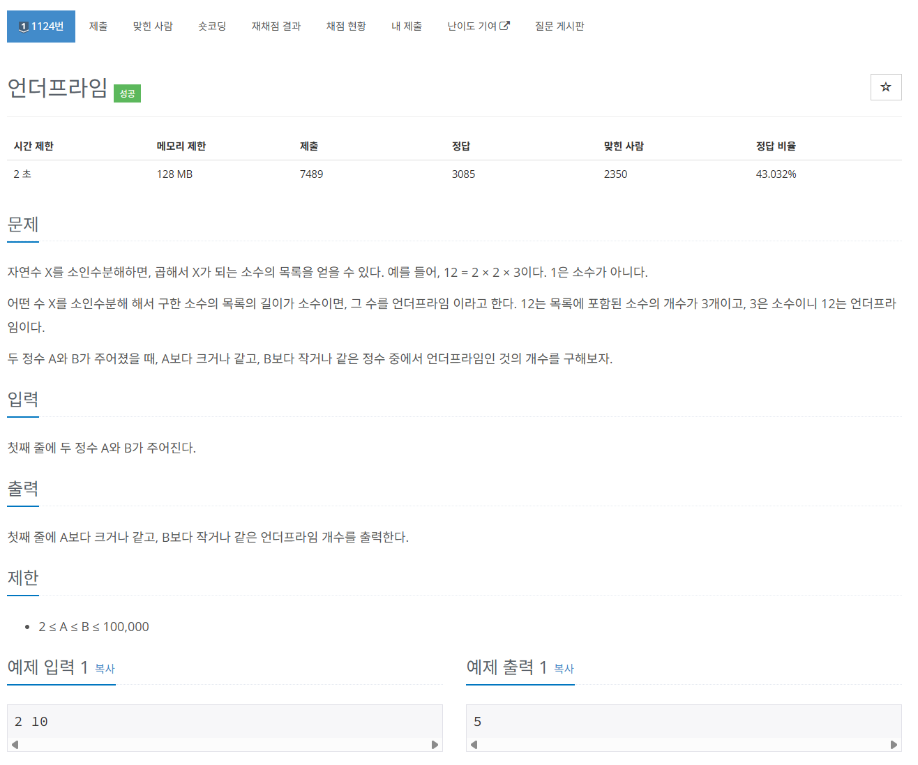 - A부터 B까지의 숫자 중에서 소인수 개수가 소수인 경우를 센다.