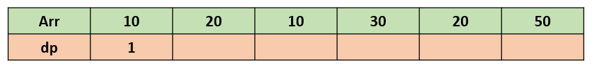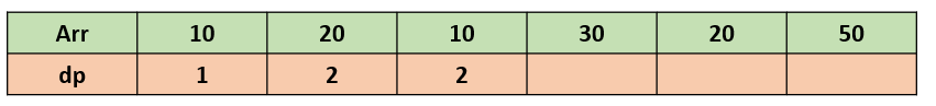 현재 값이 10이고 10보다 작거나 같은 이전 원소들 중 가장 큰 dp값이 1이므로 (Arr이 10일 때) 1 + 1 = 2를 현재 dp값으로 저장한다.