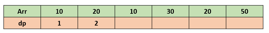 현재 값은 20이고 20보다 작거나 같은 이전 원소들 중 가장 큰 dp값이 1이므로 (Arr이 10일 때) 1+1 = 2를 현재 dp값으로 저장한다.