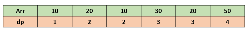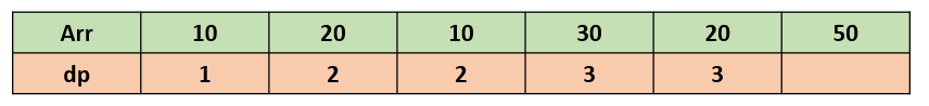 마지막 값이 50이고 50보다 작거나 같은 이전 원소들 중 가장 큰 dp 값이 3이므로 3 + 1 = 4를 현재 dp값으로 저장한다. 따라서 수열 Arr의 LIS 길이는 4이다.