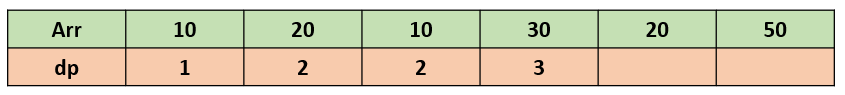 현재 값이 30이고 30보다 작거나 같은 이전 원소들 중 가장 큰 dp 값이 2이므로 (Arr이 20일 때, 혹은 10일 때) 2 + 1 = 3을 현재 dp값으로 저장한다.