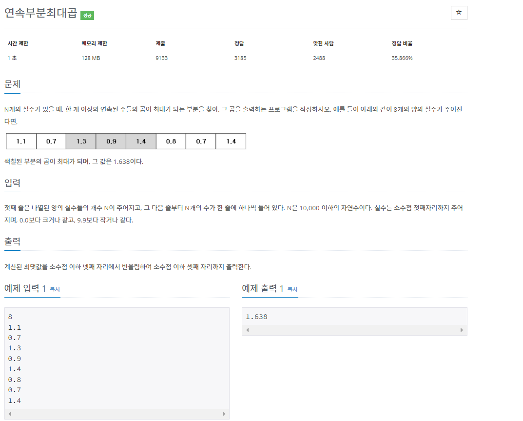 백준 2670번 연속부분최대곱 문제는 DP를 이용한 실버 4 난이도의 문제이다. 이 문제는 정답 비율이 35.866% (2022년 4월 5일 기준)으로 실버 4 난이도의 문제 치고는 낮은 편이다. 내가 생각했을 때는 아마도 소수점을 셋째 자리까지 반올림하고 출력하는 부분에서 사람들이 많이 틀리지 않나 싶다. 나도 처음에는 여기서 틀렸었다.