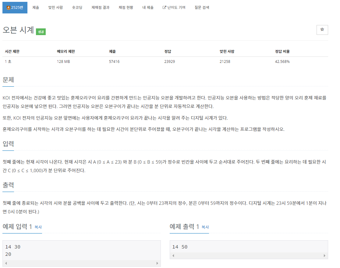 백준 2525번 오븐 시계는 또 하나의 수학 문제이다. 이 문제에서는 현재 시각이 주어지는데 현재 시각의 시 A, 그리고 분 B가 주어지고 요리하는데 필요한 시간 C가 주어진다. 그리고 A시 B분에서 C라는 시간이 흘렀을 때 그때의 시간을 출력해주면 된다.