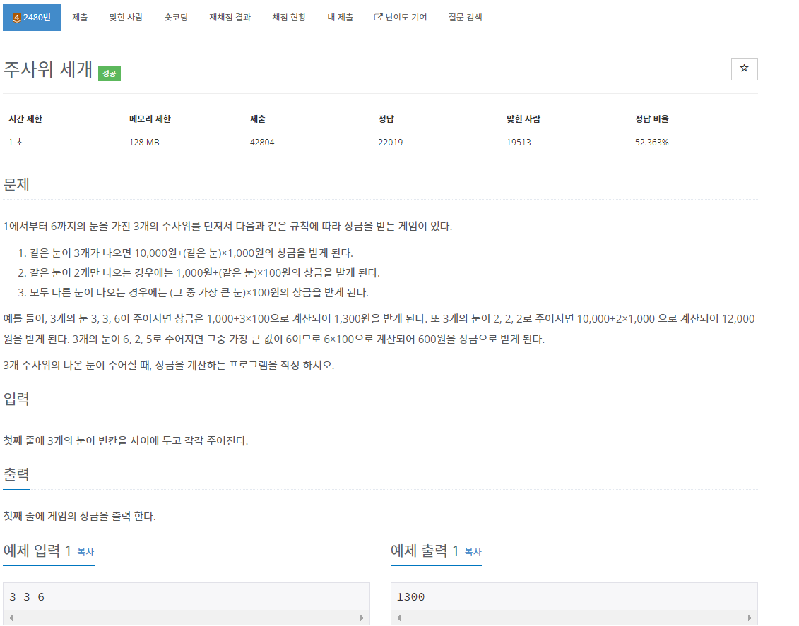 백준 2480번은 브론즈 4 난이도의 수학 문제이다. 이 문제에서는 3개의 수가 주어진다. 이를 a, b, c라고 하겠다. 이 문제에서는 3개의 경우가 있다.