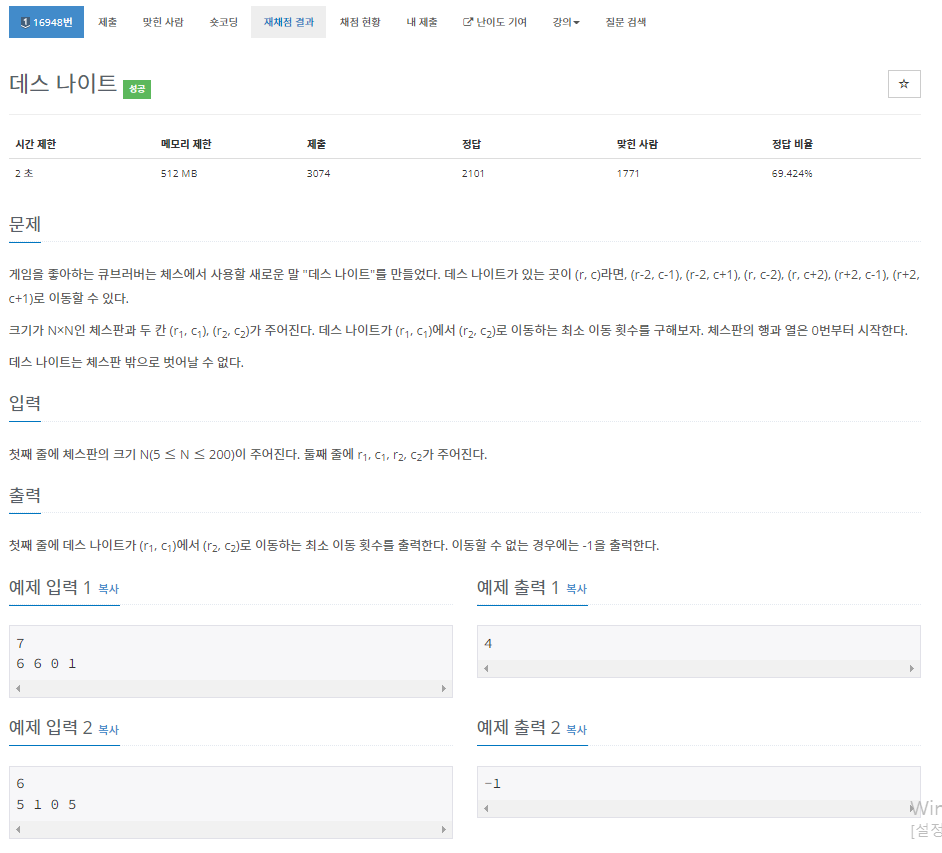 이 문제는 실버 1의 그래프 문제이다. 그리고 그래프 중에 그래프 탐색 이론인 BFS (Breadth First Search), 즉 너비 탐색을 이용한다. 첫 시작점이 (r, c)라고 가정하고 최종적으로 이동하고 싶은 점이 (r2, c2)라고 가정하겠다. 그리고 데스 나이트는 한 점이 (r, c)라면, (r-2, c-1), (r-2, c+1), (r, c-2), (r, c+2), (r+2, c-1), (r+2, c+1)로 이동할 수 있다. 이렇게 이동을 계속해서 결국에는 (r2, c2)로 갈 수 있는지 없는지만 확인하면 된다. 그리고 만약에 (r2, c2)로 갈 수 있으면 최소 이동 횟수를 구해주면 되는 문제이다.