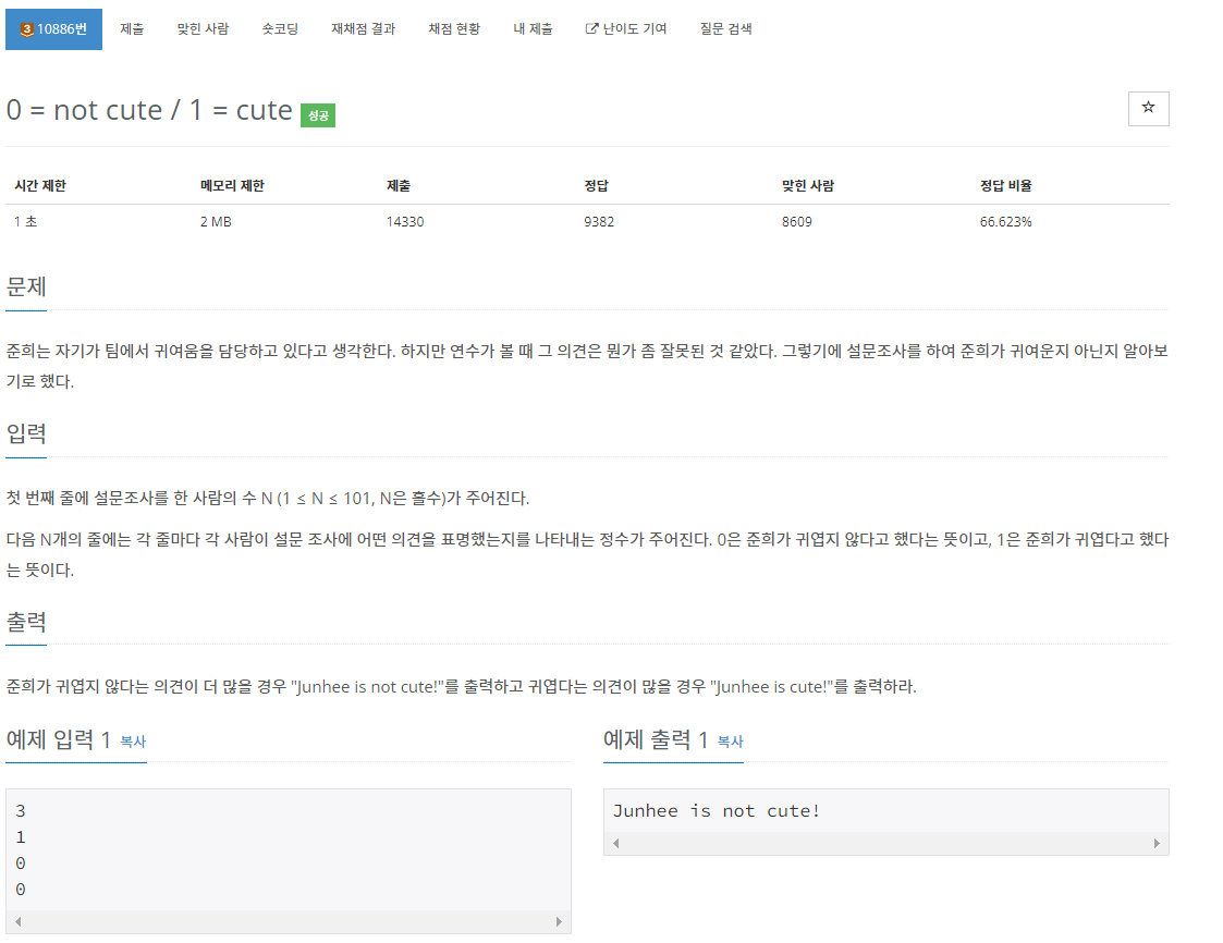 백준 10886번 0 = not cute / 1 = cute는 브론즈 3 난이도의 수학 문제이다. 이 문제에서는 우선 설문 조사를 한 사람의 수 n이 주어지고 그리고 n명이 준희에 대한 의견들이 주어진다. 1이면 준희가 귀엽다고 했다는 것이고 0이면 준희가 귀엽지 않다고 했다는 것이다.