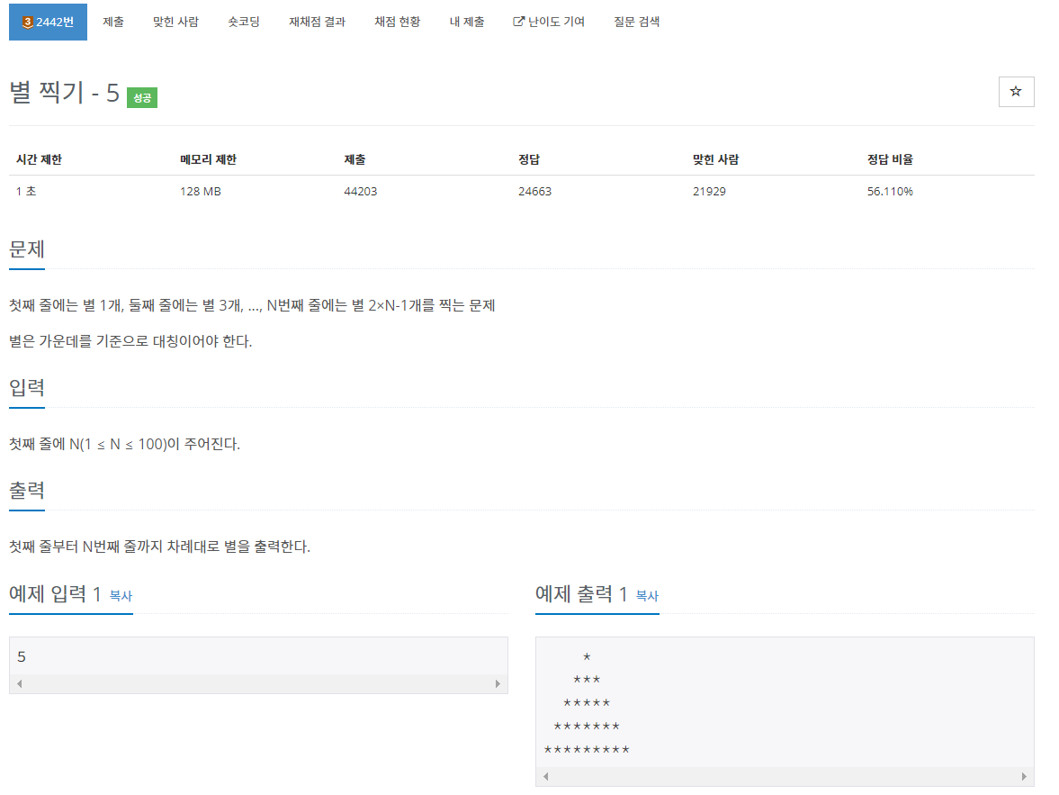 백준 2442번 별 찍기 - 5는 브론즈 3 난이도의 구현 문제이다. 그리고 이 문제는 보통 코딩을 처음 시작할 때 많이 하는 별 찍기 문제이다. 개인적인 생각이지만 이런 유형의 문제들은 코딩의 기본기를 다지는데 되게 좋은 거 같다.