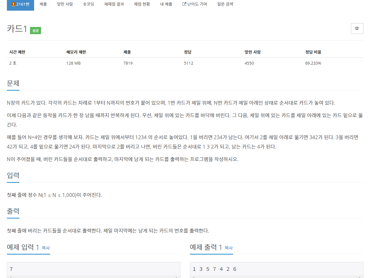 백준 2161번 카드1은 브론즈 1 난이도의 자료구조 및 구현 문제였다. 이 문제에서는 n장의 카드가 주어진다. 이 카드들은 제일 위에서부터 1부터 n까지 있다. 즉, 1이 맨 위에 있고 n이 맨 밑에 있다는 것이다. 이 카드들은 카드가 1장이 될 때까지 맨 위에 있는 카드를 먼저 버린다. 그리고 맨 위에 있는 카드를 맨 밑에 둔다. 이 절차를 카드가 1장이 될 때까지 지속한다. 카드가 1장이 되면 버린 카드들을 순서대로 출력하고 마지막에 남아있는 카드를 출력하면 된다.