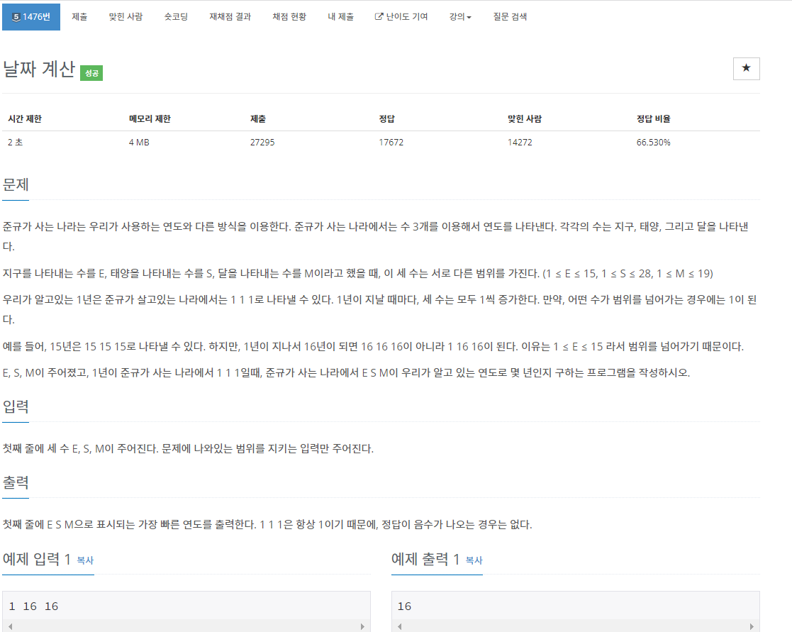 백준 1476번 날짜 계산은 실버 5 난이도의 수학 문제이다. 이 문제에서는 새로운 연도가 소개된다. 지구 연도는 e, 태양의 연도는 s, 그리고 달의 연도는 m이다. 즉, 1년은 e = 1, s = 1, m = 1이다. 그리고 각 연도마다 다른 범위가 있다. 범위들은 다음과 같다: 1 ≤ e ≤ 15, 1 ≤ s ≤ 28, 1 ≤ m ≤ 19. 각 범위를 초과하면 다시 1이 된다. e, s, m으로 연도가 주어졌을 때 가장 빠른 연도를 출력하면 되는 문제이다.