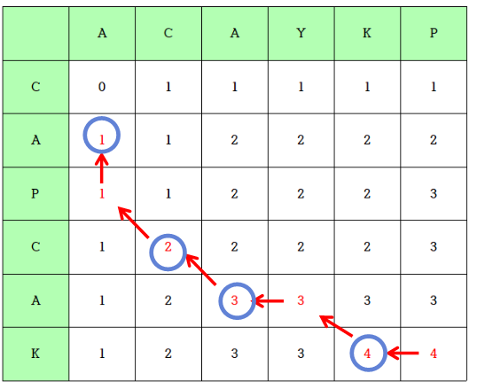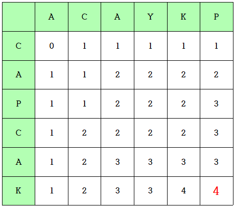 따라서 CAPCAK와 ACAYKP의 LCS는 ACAK이고 LCS의 길이는 4인 것을 확인할 수 있다.