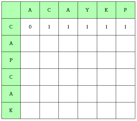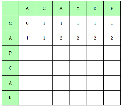 {C}와 {CAY} 나 {CAYKP}의 최장 공통부분 수열은 똑같이 {C} 이므로 나머지도 C 이후도 똑같이 1로 표시해준다.