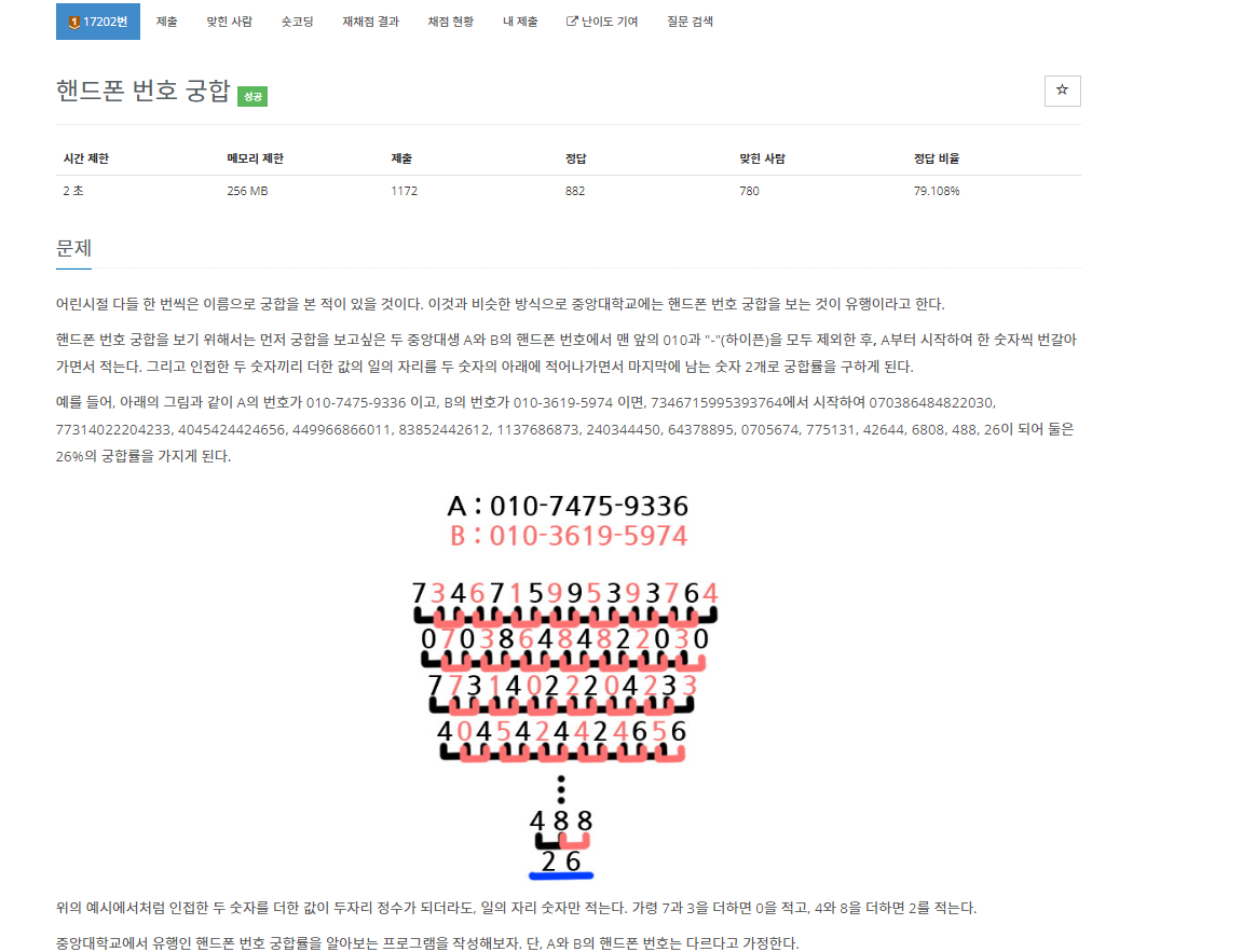 이 문제에서는 전화번호 2개가 주어진다. 그리고 이 두 전화번호의 궁합을 구하면 된다. 전화번호를 각각 A, B라고 하겠다. 전화번호의 궁합을 구하는 법은 다음과 같다 : A부터 시작하여 A, B에서 한 숫자씩 번갈아가면서 적는다. 그리고 인접한 두 숫자끼리 더한 값의 일의 자리를 두 숫자의 아래에 적어나가면서 마지막에 남는 숫자 2개로 궁합률을 구하게 된다.