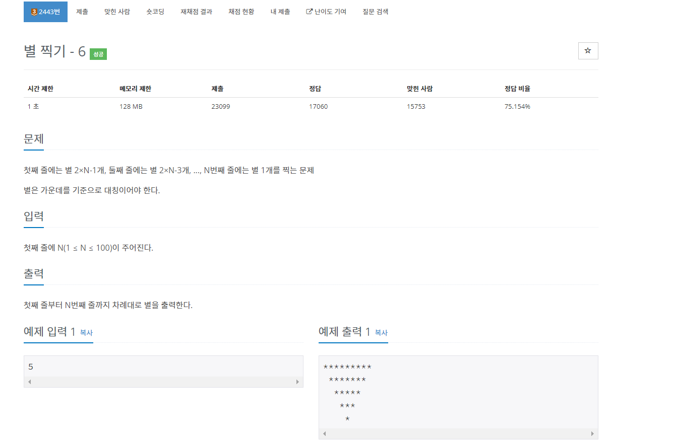 백준 2443번 별 찍기 - 6은 브론즈 3 난이도의 구현 문제이다. 이 문제도 주어지는 패턴대로 별들을 출력하면 되는 문제이다.