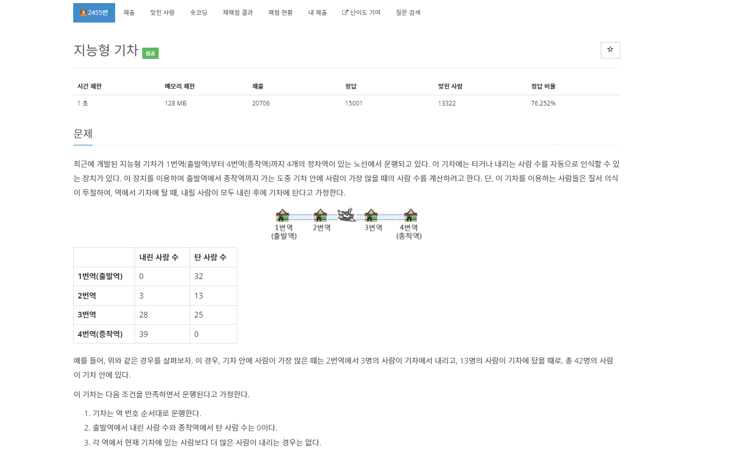 백준 2455번 지능형 기차는 브론즈 3 난이도의 수학 문제이다. 이 문제에서는 1 번역부터 4 번역까지 있는 지하철역이 있다. 1번에서 출발하고 4 번역은 종착역이다. 그리고 각 역에서 내리는 사람이 있으면 먼저 사람이 내리고 그다음에 탄다. 이때 기차에 있는 최대 사람 수를 구하면 된다.